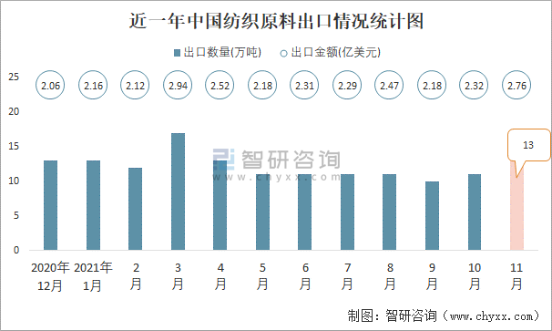 2021年11月中國紡織原料進出口數量分別為25萬噸和13萬噸