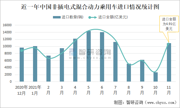 根據中國海關數據顯示:2021年11月中國非插電式混合動力乘用車進口數量為10934輛,同比下降29.4%,進口金額為4.91億美元,同比下降17.4%,2021年11月中國非插電式混合動力乘用車出口數量為869輛,同比增長563.4%,出口金額為0.12億美元,同比增長147.9%;2021年1-11月中國非插電式混合動力乘用車進口數量為103885輛,進口金額為44.7億美元,出口數量為7698輛,出口金額為0.95億美元。