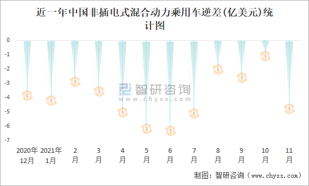 根據中國海關數據顯示:近一年中國非插電式混合動力乘用車進口金額總體大于出口金額,進出口貿易全部為逆差,10月逆差規模縮減至最小,11月大幅度擴大。