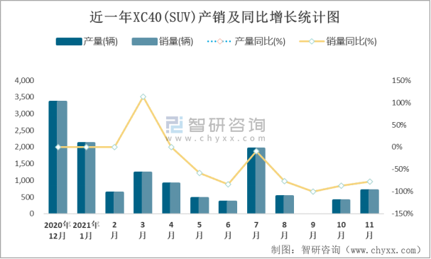 根據中國汽車工業協會數據可知:2021年11月XC40(SUV)產量為691輛,同比下降77.9%,銷量為691輛,同比下降77.9%,當月產銷率為100%;2021年1-11月XC40(SUV)累計產量為9277輛,同比下降52.4%,累計銷量為9277輛,同比下降52.4%,累計產銷率為100%。