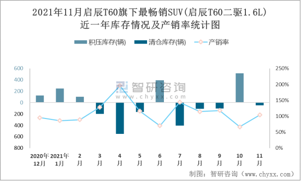 2021年11月啟辰T60旗下最暢銷SUV(啟辰T60二驅1.6L)近一年庫存情況及產(chǎn)銷率統(tǒng)計圖