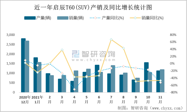 近一年啟辰T60(SUV)產(chǎn)銷及同比增長統(tǒng)計圖