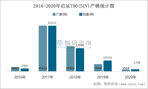 2016-2020年啟辰T90(SUV)產(chǎn)銷統(tǒng)計圖