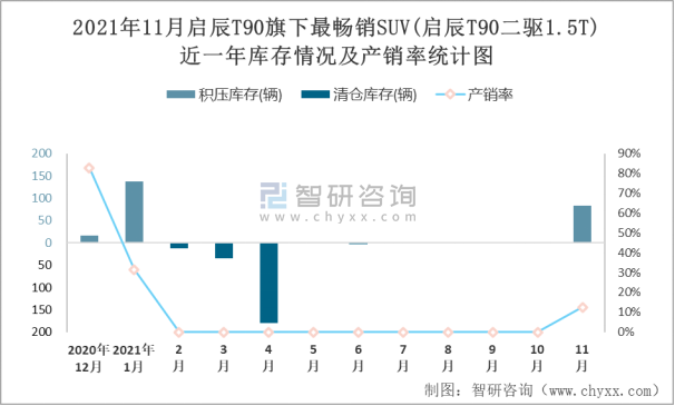 2021年11月啟辰T90旗下最暢銷SUV(啟辰T90二驅(qū)1.5T)近一年庫存情況及產(chǎn)銷率統(tǒng)計圖