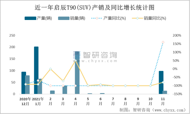 近一年啟辰T90(SUV)產(chǎn)銷及同比增長統(tǒng)計圖