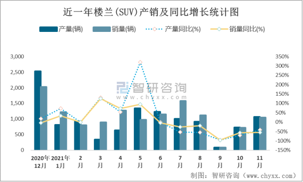 近一年樓蘭(SUV)產銷及同比增長統計圖