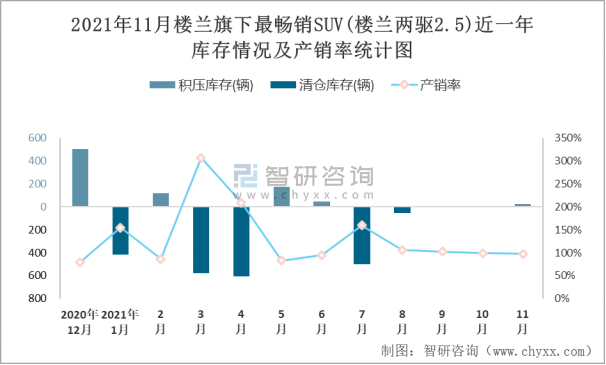 2021年11月樓蘭旗下最暢銷SUV(樓蘭兩驅2.5)近一年庫存情況及產銷率統計圖