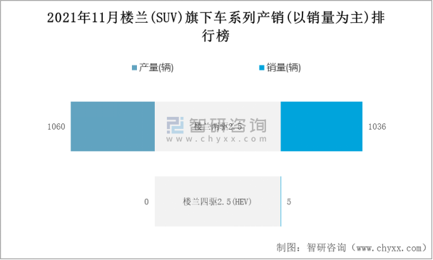 2021年11月樓蘭(SUV)產銷量分別為1060輛和1041輛 當月產銷率為98.21%