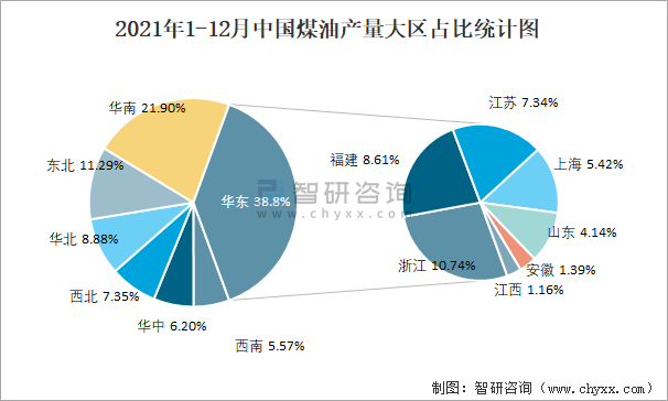 2021年1-12月中國煤油產(chǎn)量大區(qū)占比統(tǒng)計(jì)圖