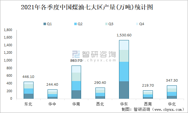 2021年各季度中國煤油七大區(qū)產(chǎn)量統(tǒng)計(jì)圖