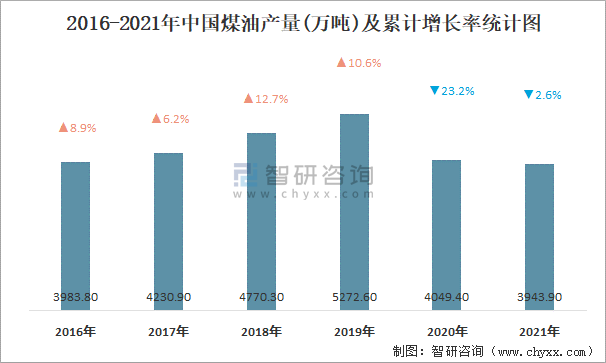2016-2021年中國煤油產(chǎn)量及累計(jì)增長率統(tǒng)計(jì)圖