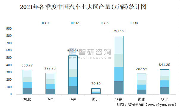 2021年各季度中國汽車七大區產量統計圖