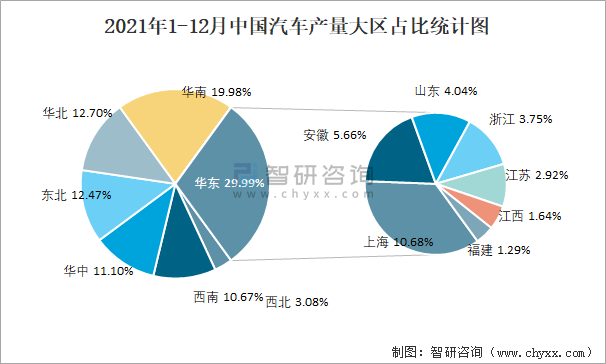 2021年1-12月中國汽車產量大區占比統計圖