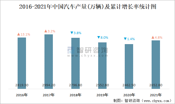 2016-2021年中國汽車產量及累計增長率統計圖