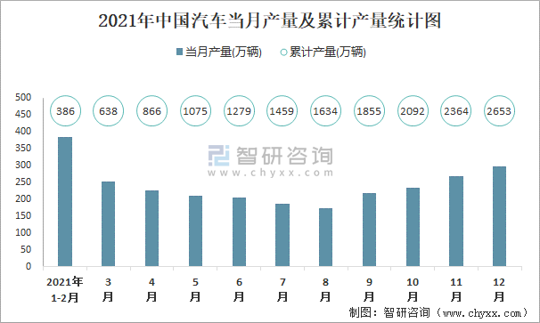 2021年中國汽車當月產量及累計產量統計圖