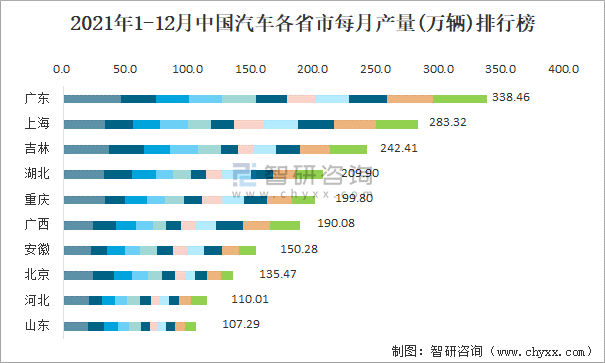 2021年1-12月中國汽車各省市產量排行榜