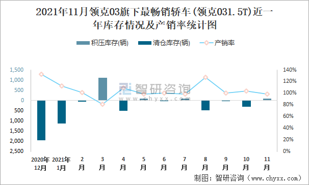 2021年11月領克03旗下最暢銷車(領克031.5T)近一年庫存情況及產銷率統計圖