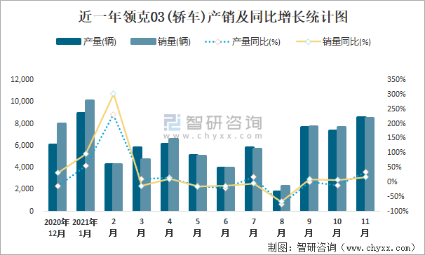 根據中國汽車工業協會數據可知:2021年11月領克03(轎車)產量為8601輛,同比增長34.5%,銷量為8503輛,同比增長17.2%,當月產銷率為98.86%;2021年1-11月領克03(轎車)累計產量為65661輛,同比增長3.7%,累計銷量為66699輛,同比增長7%,累計產銷率為101.58%;2018-2020年領克03(轎車)產銷量逐年遞增,且近3年總產量大于總銷量,積壓了庫存1381輛。