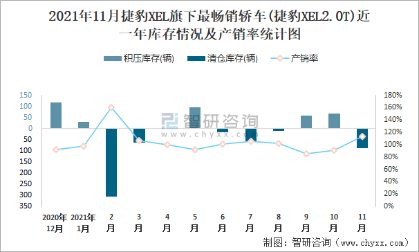2021年11月捷豹XEL旗下最暢銷車(捷豹XEL2.0T)近一年庫存情況及產銷率統計圖