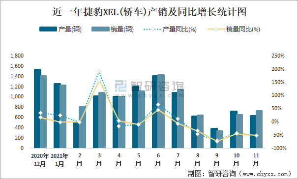近一年捷豹XEL(轎車)產銷及同比增長統計圖