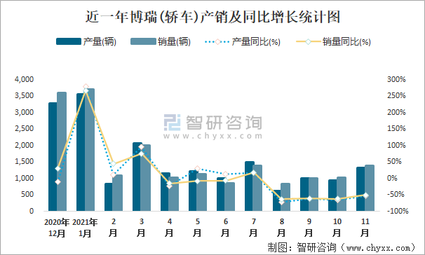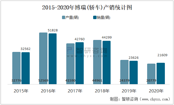 根據中國汽車工業協會數據可知:2021年11月博瑞(轎車)產量為1333輛,同比下降52%,銷量為1388輛,同比下降50.3%,當月產銷率為104.13%;2021年1-11月博瑞(轎車)累計產量為15225輛,同比下降12.9%,累計銷量為15481輛,同比下降12.6%,累計產銷率為101.68%;2015-2020年博瑞(轎車)產銷量均在2016年達到最高值,此后總體呈現下降趨勢,且近6年總產量大于總銷量,積壓了庫存370輛。