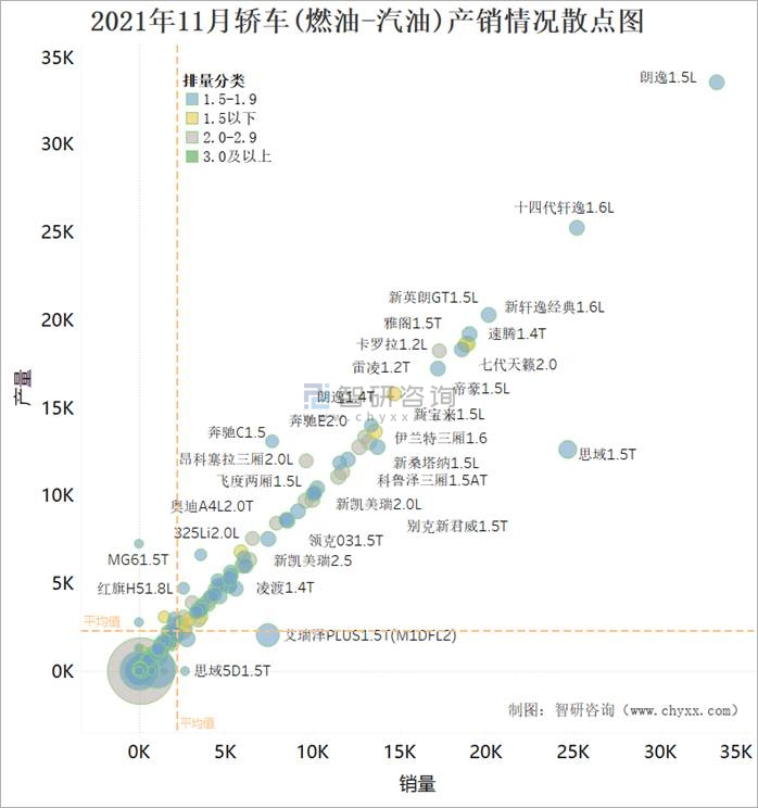 從下圖散點圖可看出,以產銷平均值作為四象限分界線,大部分燃油轎車集中在第一象限及第三象限,即產多銷多,產少銷少,特別是第三象限的部分轎車產銷率較高(散點大小代表了產銷率),庫存清理工作是這批小眾轎車的主要目標,銷量排名前十的燃油轎車中,1.5-1.9排量的轎車最多,2021年11月朗逸1.5L躍居銷量冠軍,且遠超于其他轎車銷量。