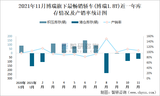 2021年11月博瑞旗下最暢銷車(博瑞1.8T)近一年庫存情況及產銷率統計圖