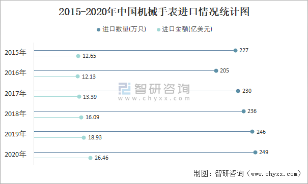 2015-2020年中國機械手表進口情況統計圖