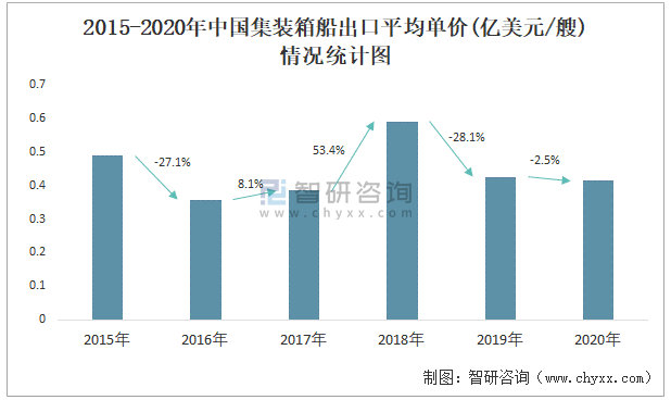 2015-2020年中國集裝箱船出口平均單價(億美元/艘)情況統計圖