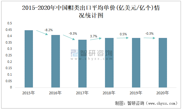 2015-2020年中國帽類出口平均單價(億美元/億個)情況統計圖
