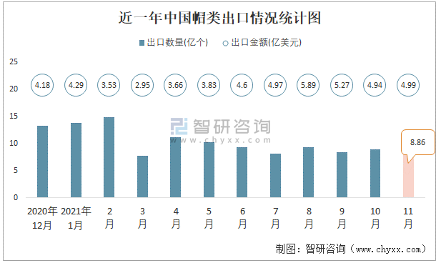 根據中國海關數據顯示:2021年11月中國帽類出口數量為8.86億個,同比下降35.9%,出口金額為4.99億美元,同比增長38.9%;2021年1-11月中國帽類出口數量為110.84億個,出口金額為48.9億美元。