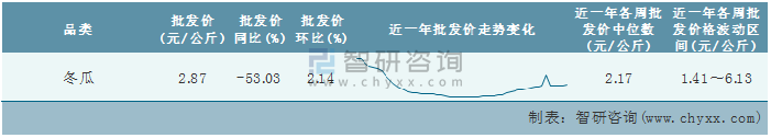 根據農村農業部數據統計可知:2022年第5周全國冬瓜平均批發價為2.87元/公斤,同比下跌53.03%,環比增加2.14%,近一年全國冬瓜平均批發價最高達到6.13元/公斤,批發價最低也要1.41元/公斤。