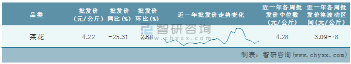 根據農村農業部數據統計可知:2022年第5周全國菜花平均批發價為4.22元/公斤,同比下跌25.31%,環比增加2.68%,近一年全國菜花平均批發價最高達到8元/公斤,批發價最低也要3.09元/公斤。
