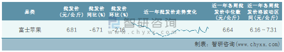 根據(jù)農(nóng)村農(nóng)業(yè)部數(shù)據(jù)統(tǒng)計(jì)可知:2022年第6周全國富士蘋果平均批發(fā)價(jià)為6.81元/公斤,同比下跌6.71%,環(huán)比下跌2.16%,近一年全國富士蘋果平均批發(fā)價(jià)最高達(dá)到7.31元/公斤,批發(fā)價(jià)最低也要6.16元/公斤。