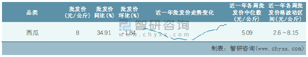 根據農村農業部數據統計可知:2022年第6周全國西瓜平均批發價為8元/公斤,同比增加34.91%,環比下跌1.84%,近一年全國西瓜平均批發價最高達到8.15元/公斤,批發價最低也要2.6元/公斤。