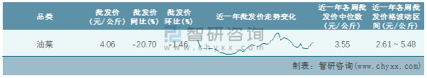 根據農村農業部數據統計可知:2022年第6周全國油菜平均批發價為4.06元/公斤,同比下跌20.7%,環比下跌1.46%,近一年全國油菜平均批發價最高達到5.48元/公斤,批發價最低也要2.61元/公斤。