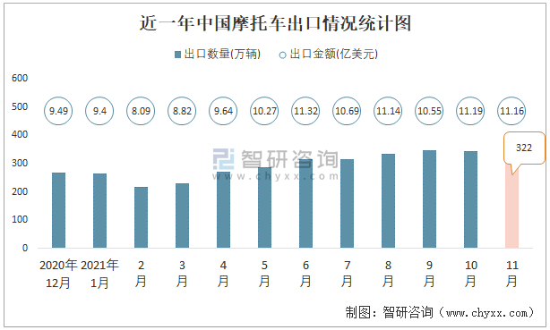 根據中國海關數據顯示:2021年11月中國摩托車出口數量為322萬輛,同比下降12.9%,出口金額為11.16億美元,同比增長12%;2021年1-11月中國摩托車出口數量為3248萬輛,出口金額為112.24億美元。