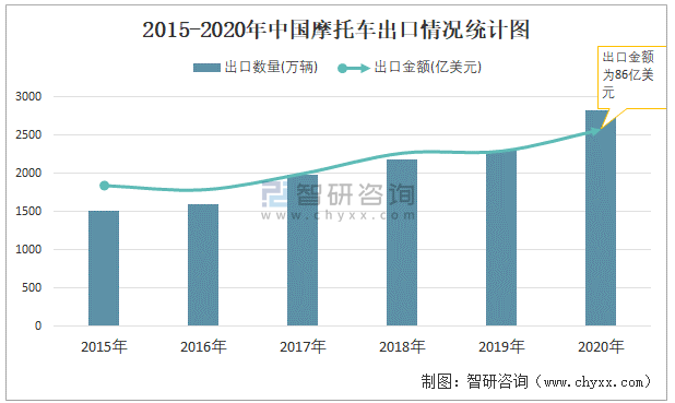 2015-2020年中國摩托車出口情況統計圖