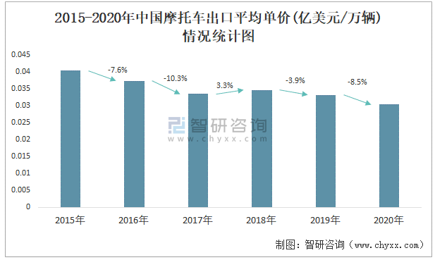 2015-2020年中國摩托車出口平均單價(億美元/萬輛)情況統計圖