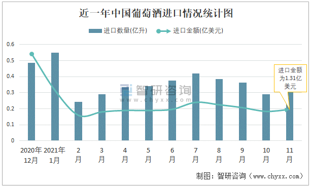 根據中國海關數據顯示:2021年11月中國葡萄酒進口數量為0.3億升,同比下降2.4%,進口金額為1.31億美元,同比下降11.5%,2021年1-11月中國葡萄酒進口數量為3.89億升,進口金額為15.25億美元。