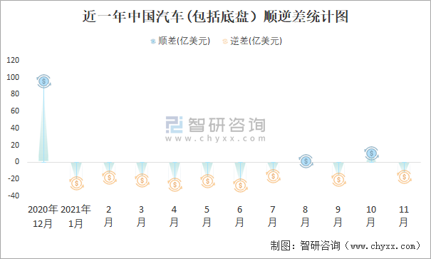 根據中國海關數據顯示:近一年中國汽車(包括底盤)進口金額總體大于出口金額,進出口貿易以逆差為主,11月由順差轉為逆差。