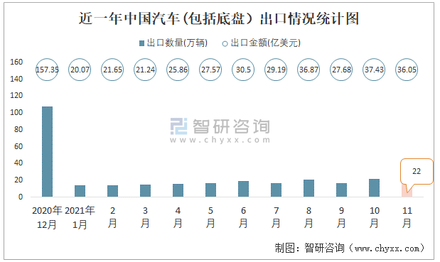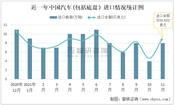 根據中國海關數據顯示:2021年11月中國汽車(包括底盤)進口數量為8萬輛,同比下降24.4%,進口金額為53.32億美元,同比下降2.1%,2021年11月中國汽車(包括底盤)出口數量為22萬輛,同比增長69%,出口金額為36.05億美元,同比增長99.2%;2021年1-11月中國汽車(包括底盤)進口數量為88萬輛,進口金額為497.49億美元,出口數量為193萬輛,出口金額為313.83億美元。