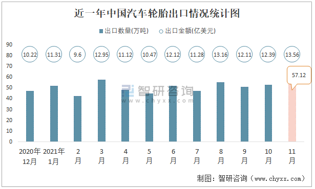 近一年中國汽車輪胎出口情況統計圖