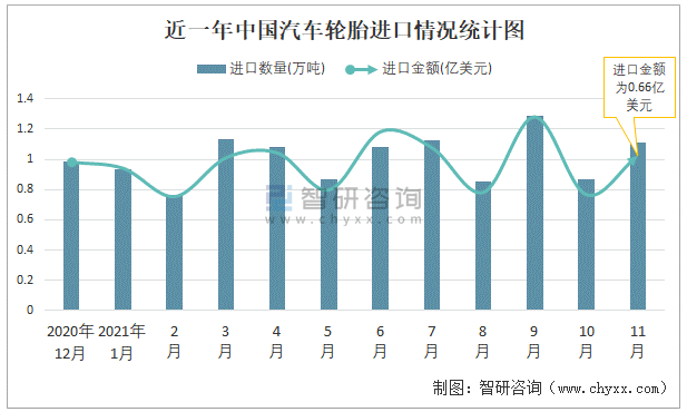 近一年中國汽車輪胎進口情況統計圖