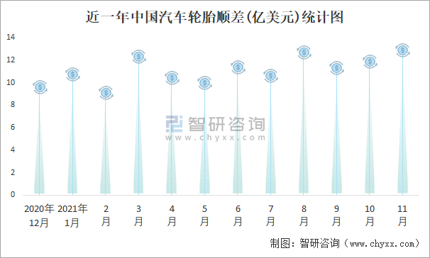 近一年中國汽車輪胎順差(億美元)統計圖