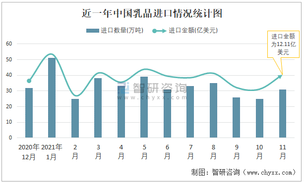 根據中國海關數據顯示:2021年11月中國乳品進口數量為31萬噸,同比增長1.5%,進口金額為12.11億美元,同比增長17.1%,2021年1-11月中國乳品進口數量為368萬噸,進口金額為127.36億美元。