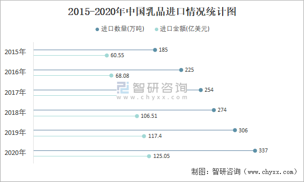 2015-2020年中國乳品進口情況統計圖