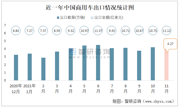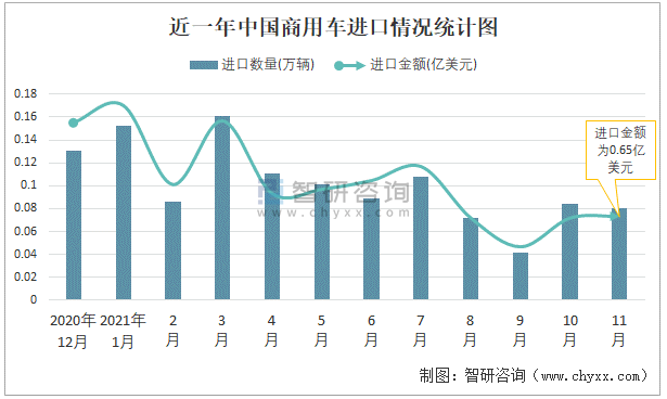 根據(jù)中國海關數(shù)據(jù)顯示:2021年11月中國商用車進口數(shù)量為0.08萬輛,同比下降51.2%,進口金額為0.65億美元,同比下降62.8%,2021年11月中國商用車出口數(shù)量為4.27萬輛,同比增長49%,出口金額為11.12億美元,同比增長85.7%;2021年1-11月中國商用車進口數(shù)量為1.08萬輛,進口金額為9.79億美元,出口數(shù)量為43.6萬輛,出口金額為107.34億美元。