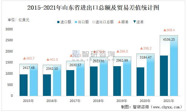 2015-2021年山東省進出口總額及貿易差值統計圖