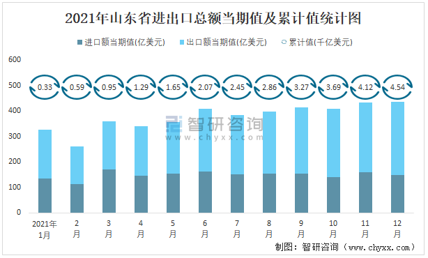 2021年1-12月山東省進出口總額為4.54千億美元,累計同比增長41.7%